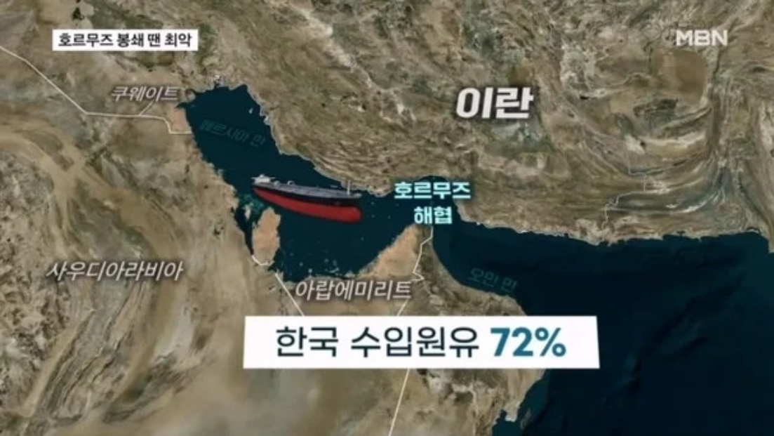 한국은 원유 수입의 약 71%를 중동에 의존한다. 거의 전량이 호르무즈를 경유한다. 비축유는 약 7개월치.